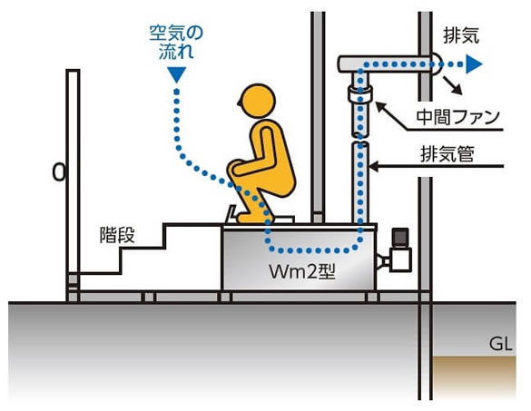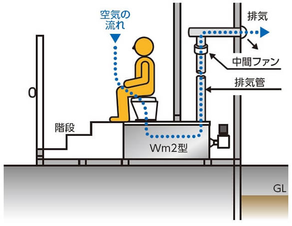 空気の流れとオガクズ効果によって、トイレ室内は無臭です。