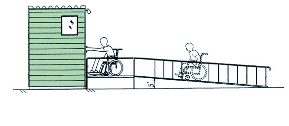 車椅子対応のバリアフリー設計で、広い室内、手すり、スロープ付きとなっています。