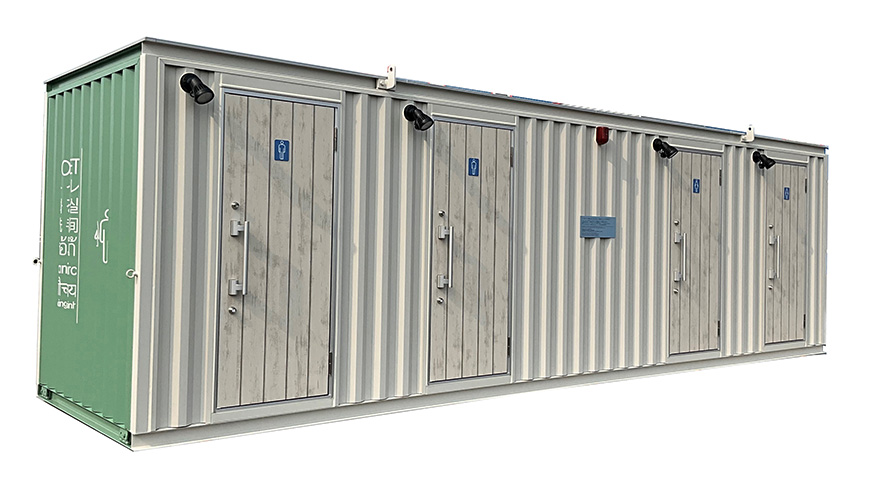 バイオトイレ43型4台を蔵、各トイレは1日100回、合計4台で毎日400回使用、毎日使用し約4カ月間、オガクズ交換無しで使用できます。(電源は100V40A)