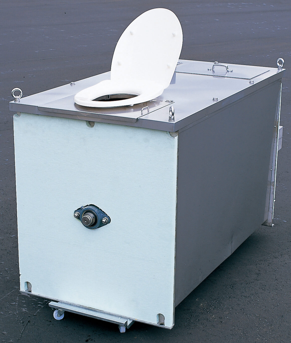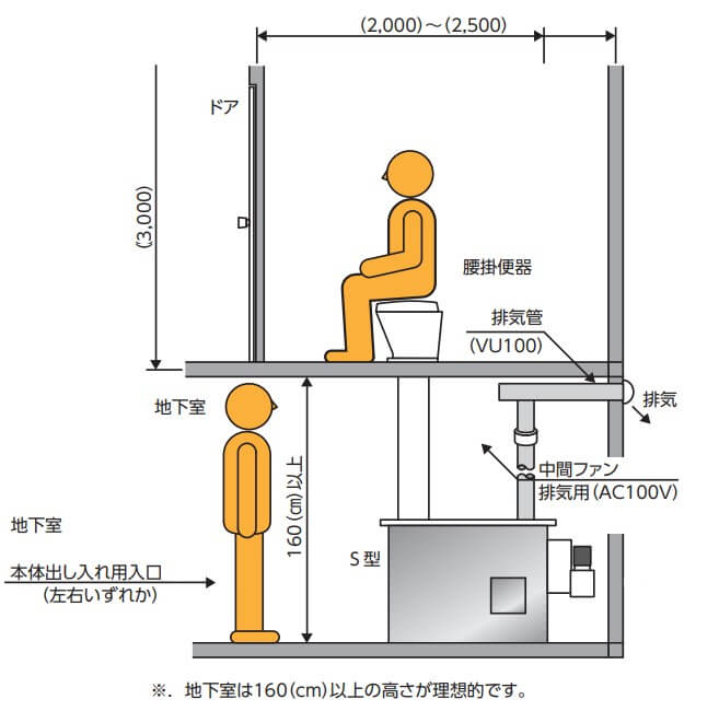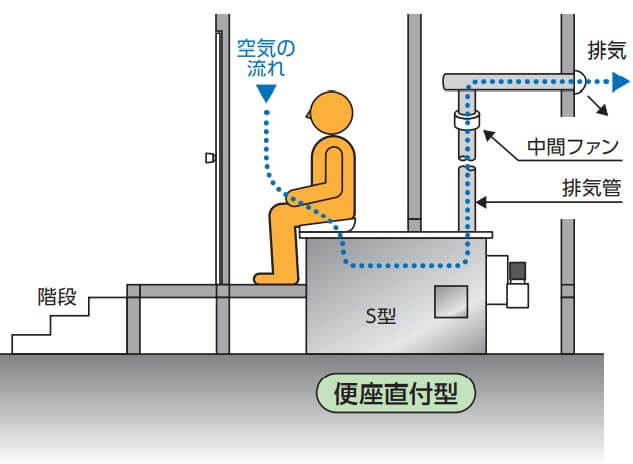 Bio-Lux本体S型は、標準型と便座直付型の2タイプからお選びいただけます。 標準型はトイレ室内の下(地下室など)にBio-Lux本体S型を設置することにより、トイレ室内は洋式トイレのようにご使用いただけます。 オプション品のスパット、腰掛式非水洗便器、便座をご用意いただく必要があります。 便座直付型はBio-Lux本体S型に直接便座を取り付けて使用します。 オプション品の便座をご用意いただく必要があります。 洗浄便座を取付することも可能です。