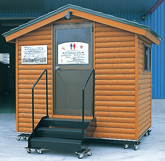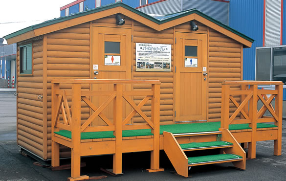 ログハウス風の外観で、自然の風景に溶け込みやすいデザインの仮設トイレです。
